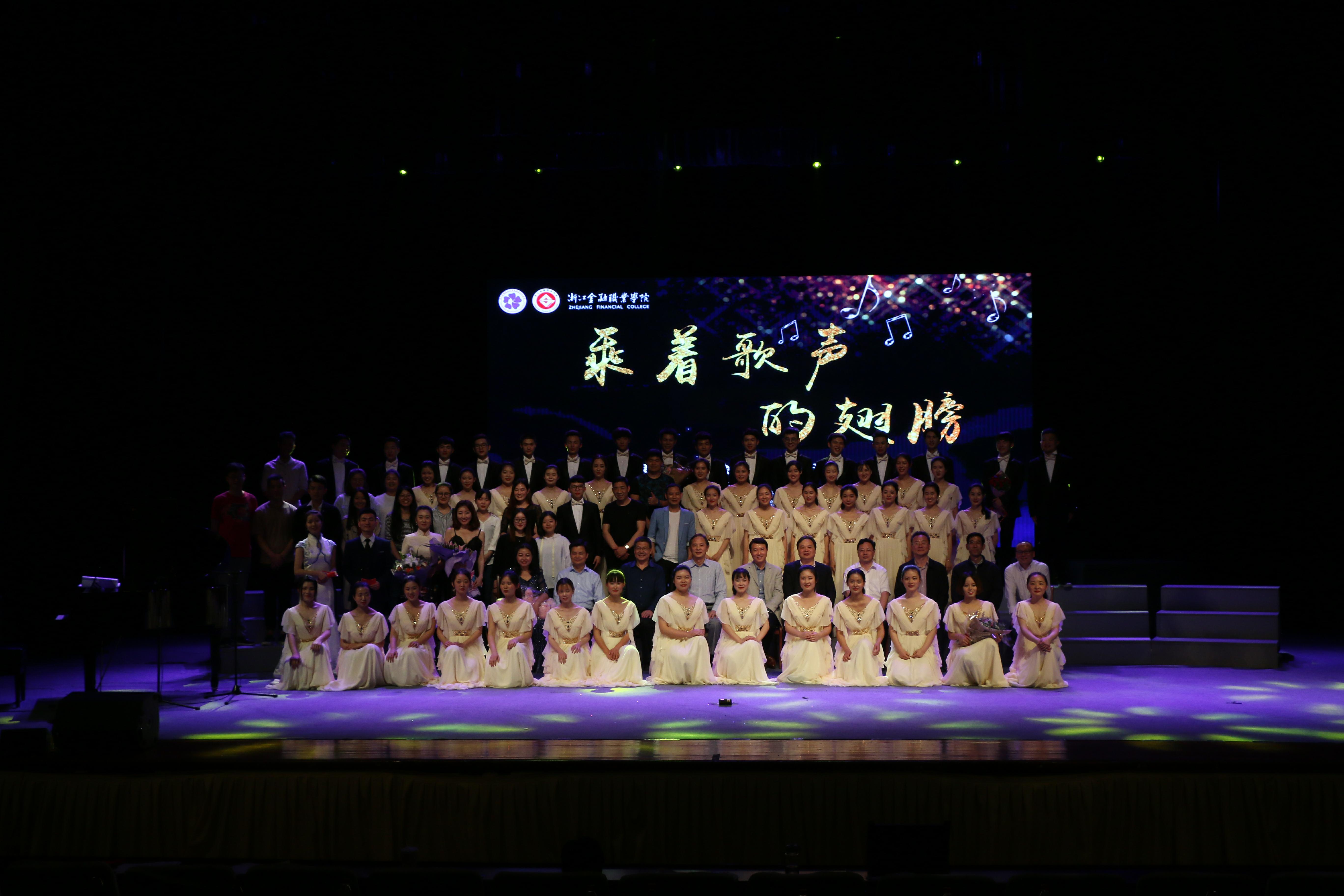 2017年5月5日晚,浙江金融职业学院紫罗兰声乐协会“乘着歌声的翅膀”合唱专场音乐会在金葵花艺术中心成功举办。学校党委书记周建松、党委副书记姜进、副校长郭福春、校党委委员吴建斌,以及学生处、教务处、督导处、审计处、基建后勤处等职能部门、各二级学院领导莅临音乐会现场,音乐会还吸引了来自我校毕业的校友、社会各界人士以及我校喜爱合唱艺术的同学们聆听出席。