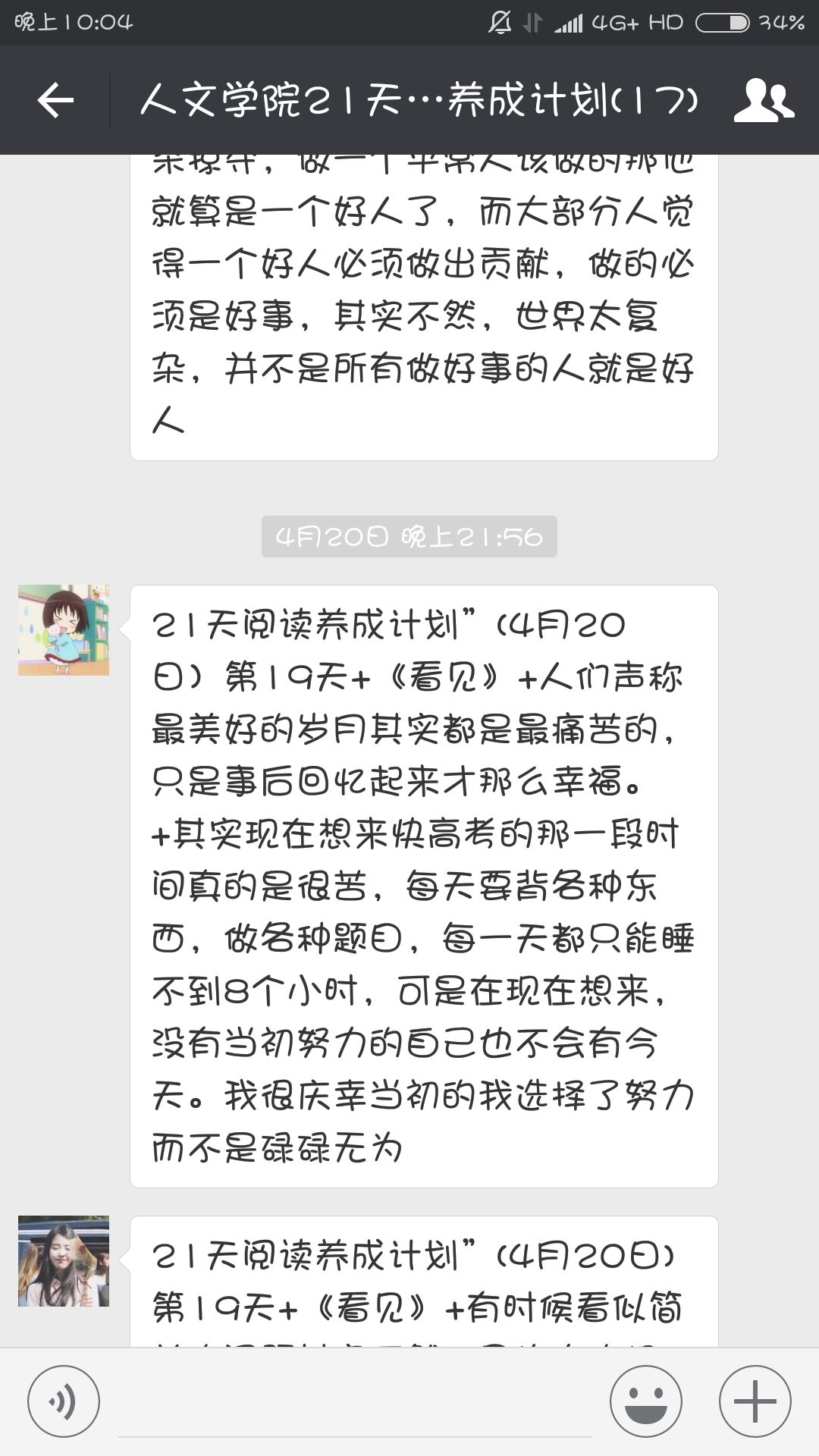 在这21天中,这15位同学每天阅读柴静的《看见》,摘录让自己有感触的话并写下了自己的感受,并坚持每天在“人文艺术学院21天阅读养成计划”微信群发布共享。511日下午1500,第四期读书交流会在8号楼五楼国学园地召开,学院文秘专业教师梁怀超老师与同学们分享阅读感想,大家带上读后感,畅谈阅读感悟和体会。