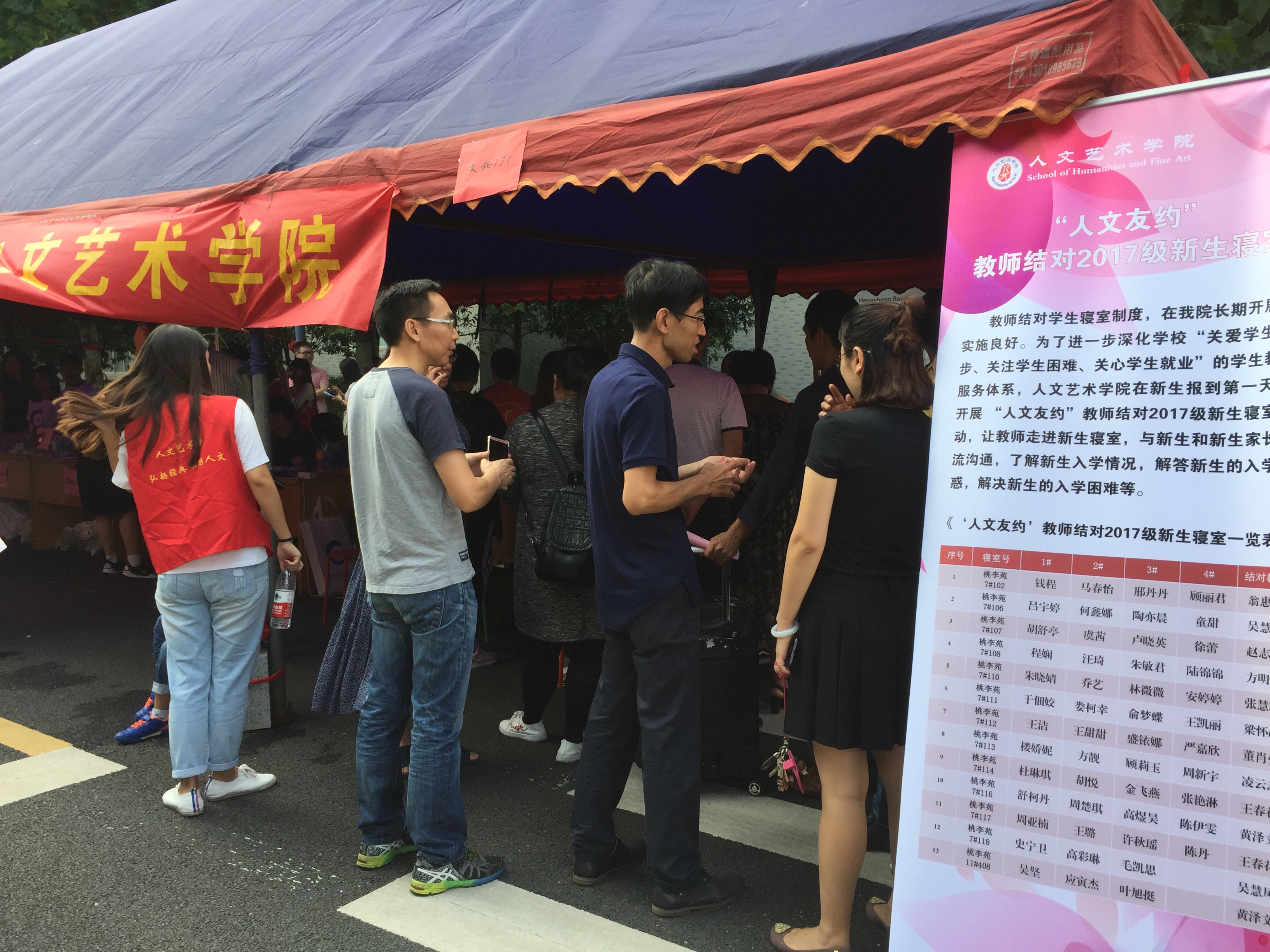 为了进一步深化学校“关爱学生进步、关注学生困难、关心学生就业”的学生教育服务体系,人文艺术学院在新生报到第一天便开展 “人文友约”教师结对2017级新生寝室活动,报到当天,学院院长翁惠根带领教师走访全体新生寝室,与新生和新生家长交流沟通,了解新生入学情况,解答新生的入学困惑,解决新生的入学困难等。
