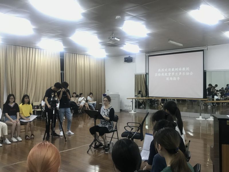 戴树林教授是非常有经验的合唱训练指导老师,今天来到我校与紫罗兰声乐协会的师生进行了非常愉快的交流,合唱团的老师和同学们对戴老师的到来表示了热烈的欢迎。戴老师就合唱团近期“爱生节”十周年以及大艺展排练的作品,从发声、音准、歌曲艺术表现力等方面进行全面的指导。她通过丰富的姿体语言、夸张的表情,生动形象地引导同学们科学发声,利用多样化的训练手段让同学们感受歌曲的情感。通过她的指导,同学们的演唱得到了明显的改变,歌声更加优美和谐,表演更加融入声音艺术。戴树林教授的指导让现场师生开阔了眼界,大家都感觉受益匪浅。