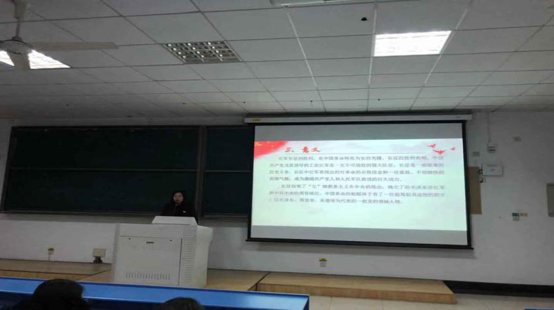 在专题党课上,吴慧凤老师首先从讲解毛泽东的《七律·长征》,以及观看关于长征的艺术表演展开我们此次党课的内容。接着用历史资料、图文和影音资料等为党我们生动形象地讲解了史诗般的二万五千里长征,讲述了长征的背景、经过、意义以及长征所体现出的精神,梳理了从瑞金出发、突破敌四道防线、强渡乌江、占领遵义、四渡赤水、巧渡金沙江、强渡大渡河、飞夺泸定桥、翻雪山、过草地、陕北吴起会师、甘肃会宁会师等历史脉络,并给我们介绍大型声乐奏曲、红色经典史诗《长征组歌》,用艺术的形式再现了长征艰难的历程,让我们更加清晰地认识到中国革命的先进性本质,共产党人运用聪明智慧,凭借坚定的信念取得的一次又一次胜利。党课的最后,吴慧凤书记让同学们大声朗读了顾全大局、严守纪律、亲密团结的长征精神。