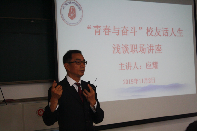演讲中应耀学长结合自身十余载艰辛的就业经历,分享了成功经验。他提出了多条建议:先干后学比较重要;选择一个有竞争的行业,有竞争才有机会,要把握机会不要轻言放弃,勇于挑战未来;把所学的知识运用到实际的工作中去,勤能补拙;学长呼吁在场的学生代表们正确认识自己的价值与能力、摆正姿态、寻找合适自己的职业,合理利用自己的课余时间、多多参加社会实践活动、打造自己的精彩人生。