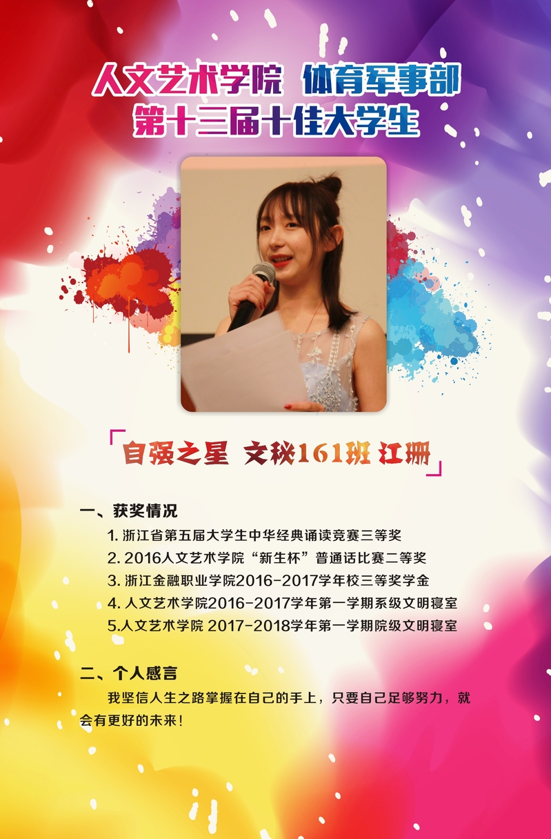 江珊,女,来自文秘161班,曾任人文艺术学院学生会主席一职。该生在校期间各方面表现优异,曾获浙江省第五届大学生中华经典诵读竞赛三等奖、校第十三届“十佳大学生”自强之星、2016院“新生杯”普通话比赛二等奖、2016-2017学年校三等奖学金等多个荣誉。