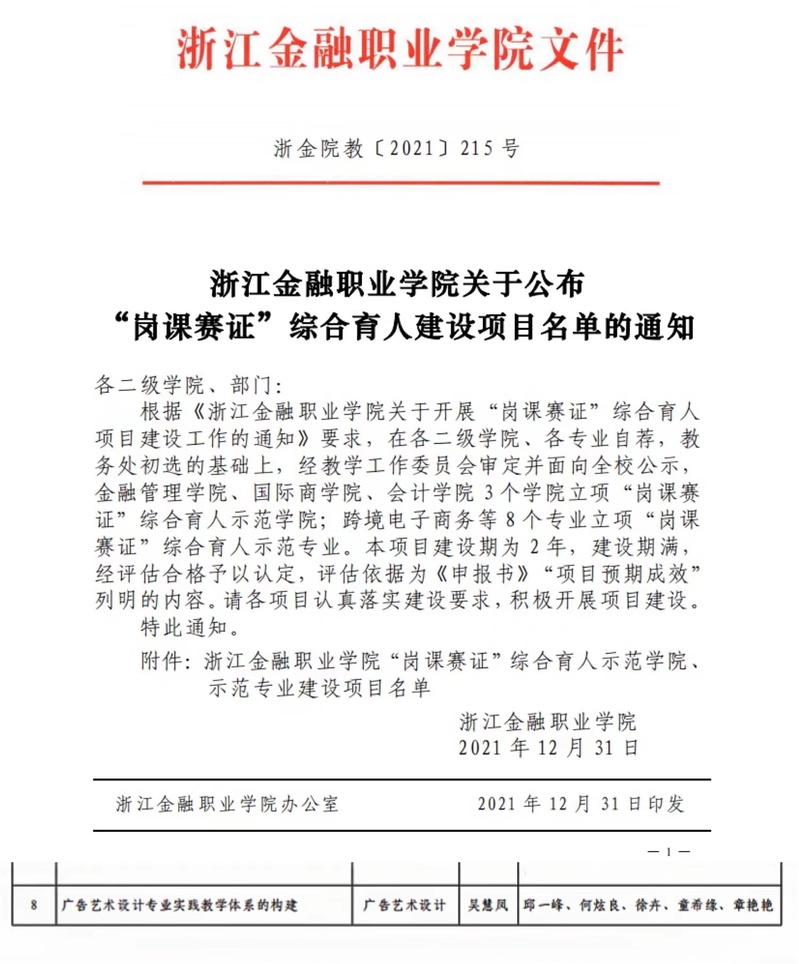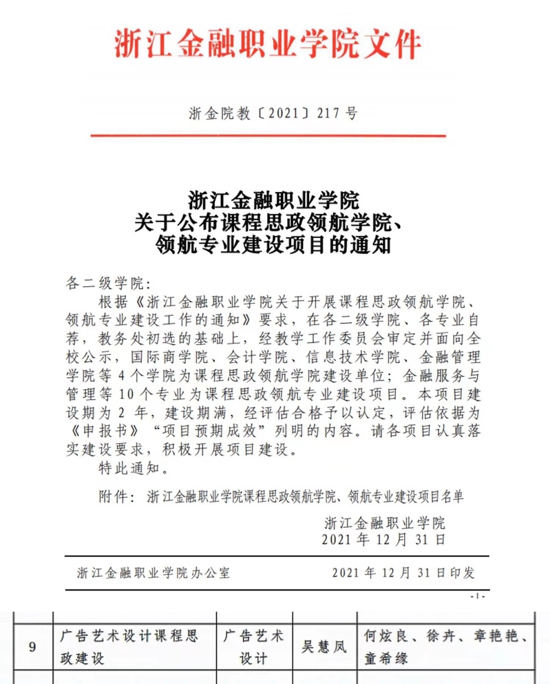 1、文创专业群获学校教学成果一等奖;广告艺术设计专业获课程思政领航专业建设项目;校级课程思政示范课程4门;学校“岗课赛证”综合育人示范专业建设项目1个。
