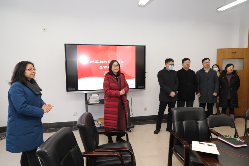 新学期,新气象,新征程。2022年2月24日开学第一天一早,学校校长郑亚莉、党委副书记王琦、纪委书记张江琳、副校长郭福春、党委委员、教务处处长孔德兰等一行到人文艺术学院6218会议室慰问全体教职工。郑亚莉祝愿大家新的一年虎虎生威,各项教学管理工作取得更大成绩。王琦代表学校专程送上新年红包。人事处相关负责人陪同慰问。
