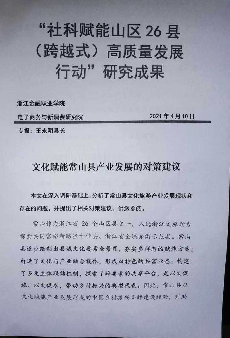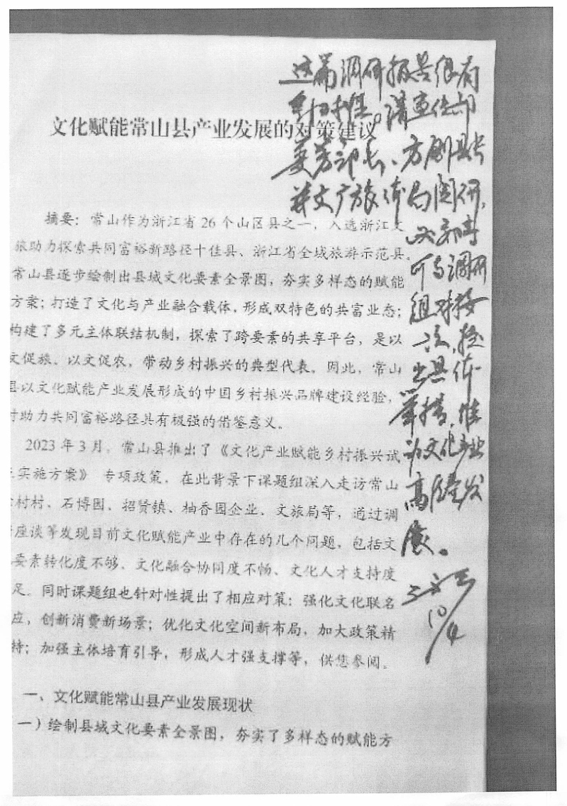 课题组成员在深入调研基础上,从“绘制县域文化要素全景图、夯实多样态的赋能方案,打造文化域产业融合载体、形成双特色的共富业态模式,构建多元主体联结机制、探索夸要素共享平台”三方面分析常山县产业发展现状,针对现状又分别从“文化要素、文化融合协同度文化人才”三方面分析发展存在的问题,最终从“强化联名效应、创新消费新场,优化文化空间布局、加大政策精扶持以及加强主体培育引导、形成人才强支撑”三方面提出发展的对策建议。