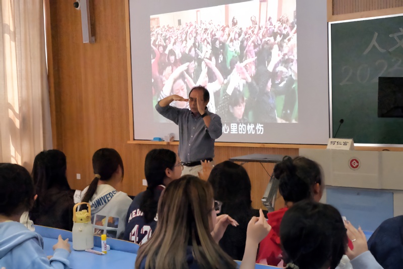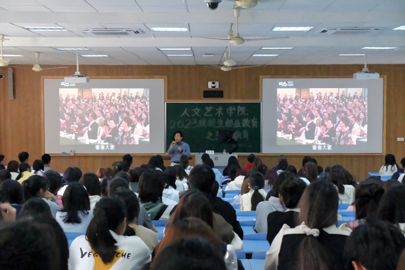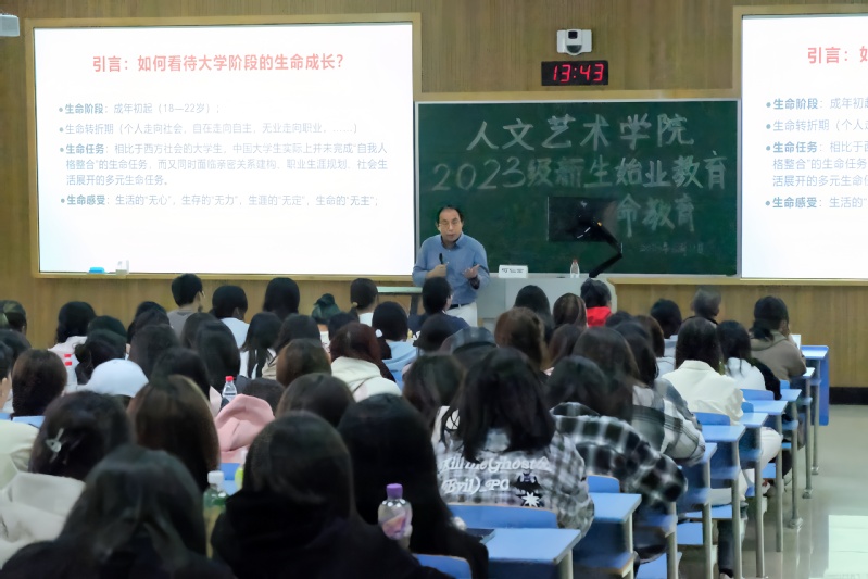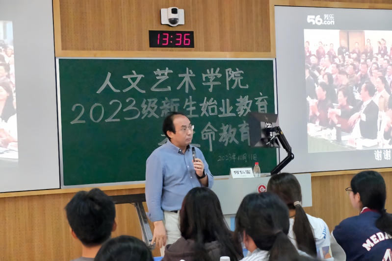 何仁富教授以手语歌——《生命的河》为开端,引导同学们在歌曲中感受生命的力量。面对200多位人文艺术学院新生,何教授以“如何看待大学阶段的生命成长”为问题,启发同学们建构自主人生,自觉思考人生议题。他讲到,自主自觉交往、承担和融入是大学生阶段生命教育的任务,要认识到生命自主意识、生命自觉意识、生命共同体意识这三种大学生教育理念的重要性。
