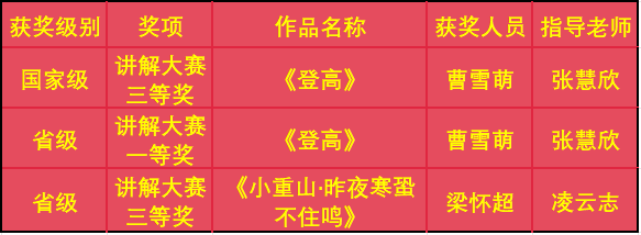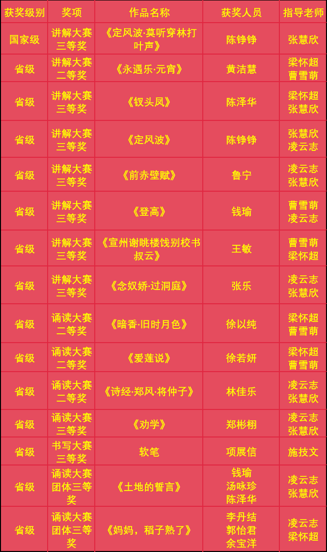 截至2023年10月29日,浙江金融职业学院人文艺术学院师生参加全国第五届中华经典诵写讲大赛及浙江省第十一届中华经典诵写讲大赛,我院凌云志、梁怀超、张慧欣、曹雪萌老师带队参加了比赛,最终获得全国讲解大赛教师组三等奖1项,全国讲解大赛学生组三等奖1项;全省讲解大赛高校教师组一等奖1项、三等奖1项,学生组二等奖1项、三等奖6项,全省诵读大赛学生组个人组二等奖3项、三等奖1项,全省诵读大赛学生组团体组三等奖3项;全省书写大赛三等奖1项。本次大赛由是由教育部、国家语委主办,教育部语言文字应用管理司负责实施的公益性、全国性赛事活动,每年举办一届。