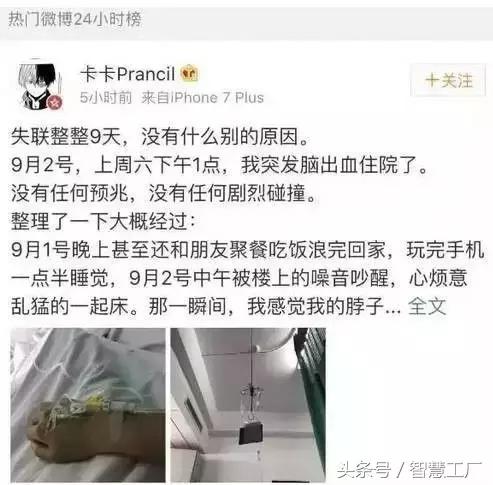 前段时间刷屏网络的年轻网友@卡卡Prancil,因为长期熬夜,突发脑溢血,幸亏用仅有的一丝意识为自己